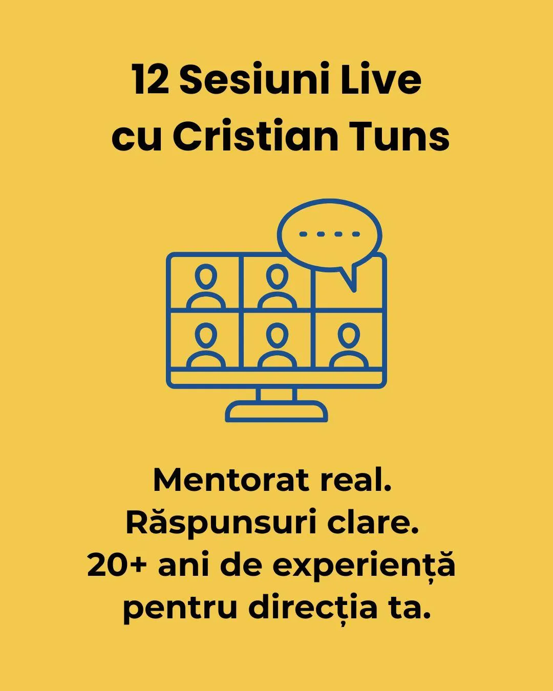 Primești acces imediat la cursul video complet + 12 sesiuni live, câte una pe săptămână, cu Cristian Tuns. În fiecare săptămână ai direcție clară, un plan de acțiune și sprijin real din partea mentorului și a grupului. Totul este structurat, pas cu pas.
